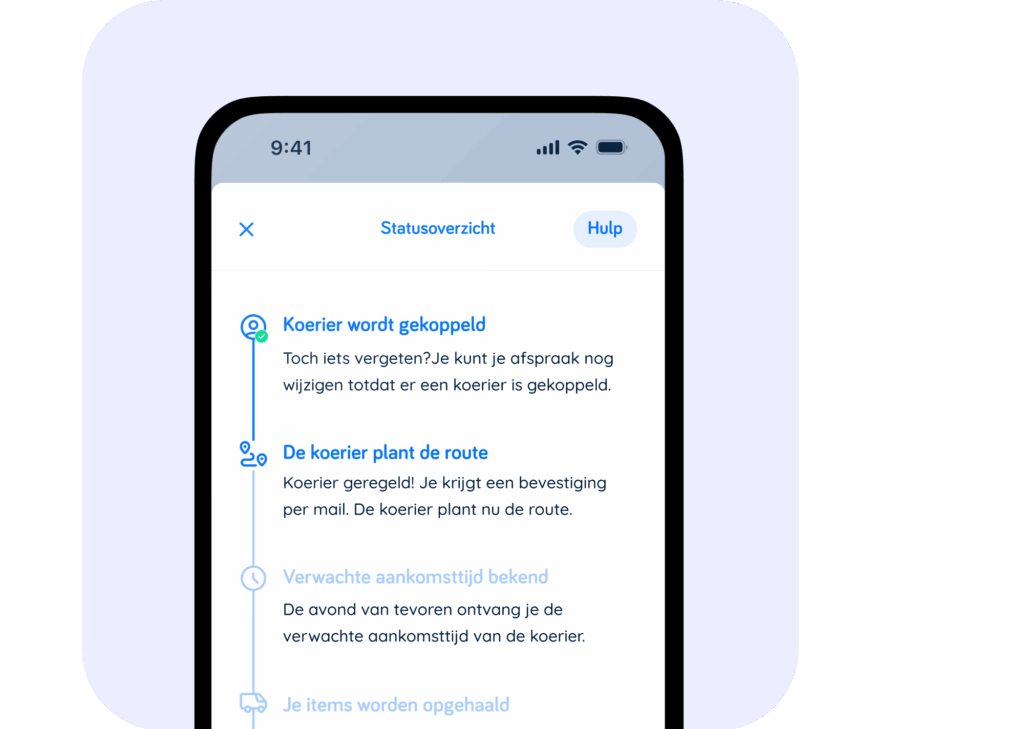 In je bevestigingsmail vind je een knop ‘Bekijk status’ waarmee je naar de tracking pagina kunt gaan. Hier kun je de koerier volgen en de status van je transport bekijken.
